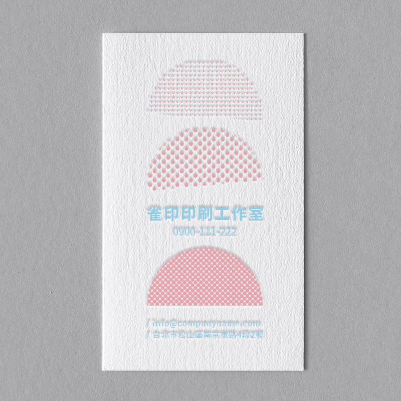 以凸板印刷印製的名片,採用300gsm 凸版專用棉紙,質地厚實觸感柔軟,多種墨色可選。印刷處因壓力可能產生些許凹陷。
