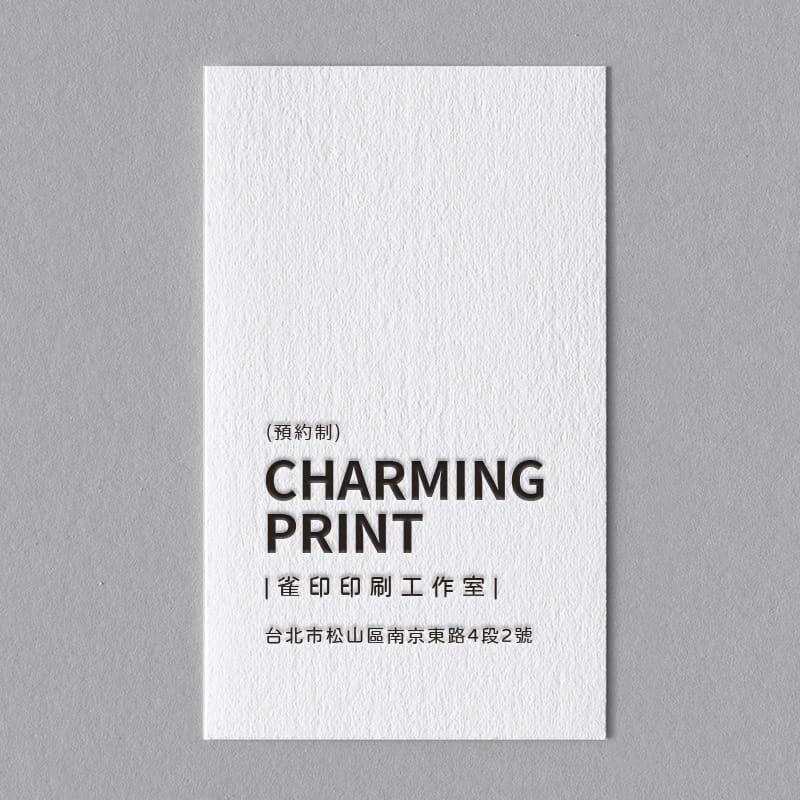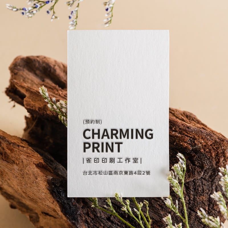以凸板印刷印製的名片,採用300gsm 凸版專用棉紙,質地厚實觸感柔軟,多種墨色可選。印刷處因壓力可能產生些許凹陷。