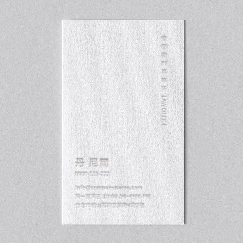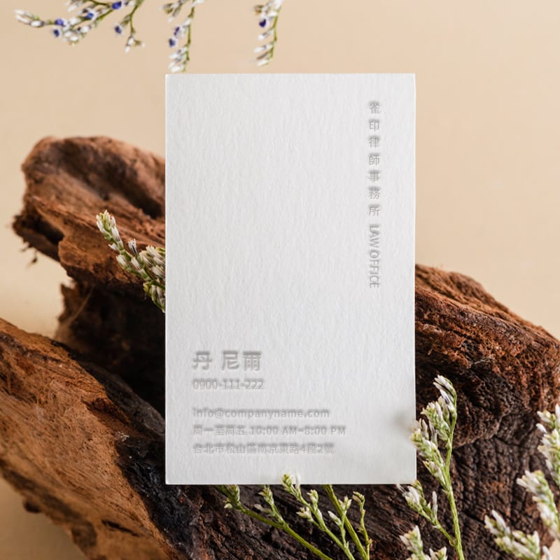 以凸板印刷印製的名片,採用300gsm 凸版專用棉紙,質地厚實觸感柔軟,多種墨色可選。印刷處因壓力可能產生些許凹陷。
