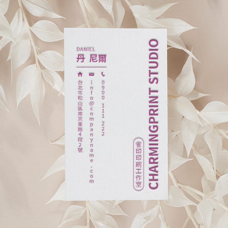 以凸板印刷印製的名片,採用300gsm 凸版專用棉紙,質地厚實觸感柔軟,多種墨色可選。印刷處因壓力可能產生些許凹陷。