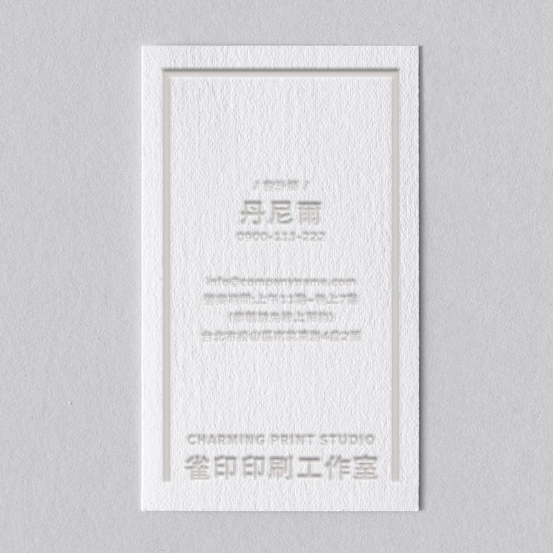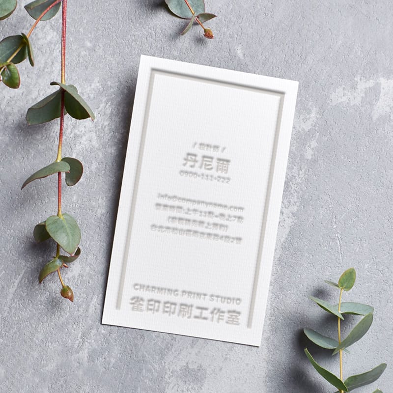 以凸板印刷印製的名片,採用300gsm 凸版專用棉紙,質地厚實觸感柔軟,多種墨色可選。印刷處因壓力可能產生些許凹陷。