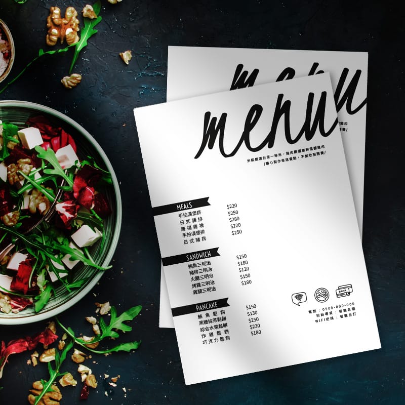 文青A4尺寸菜單,適合咖啡店、小餐館、餐酒館,簡單大方的設計,少量即可製作,多種頁數選擇。