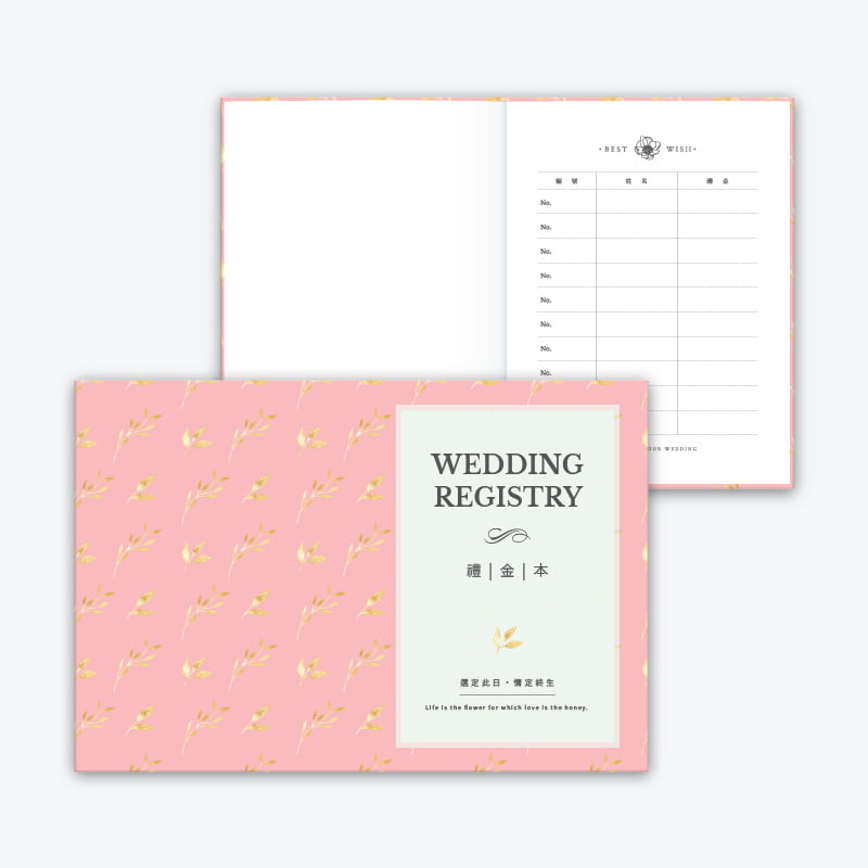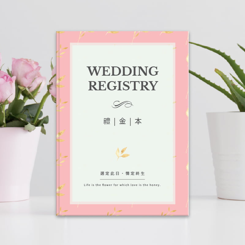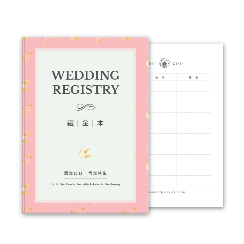 婚禮收禮處使用的禮金簿,可客製調整封面與封底,表面霧膜滑順觸感,24 頁畫刊紙內頁共240欄,每頁可書寫 10 位賓客