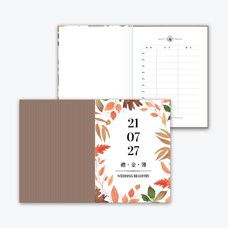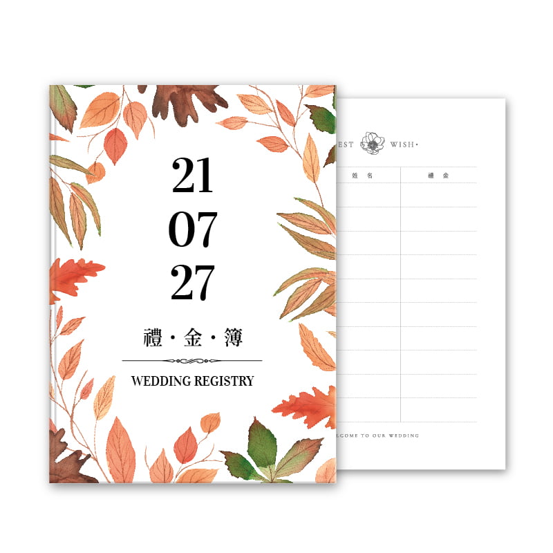 婚禮收禮處使用的禮金簿,可客製調整封面與封底,表面霧膜滑順觸感,24 頁畫刊紙內頁共240欄,每頁可書寫 10 位賓客