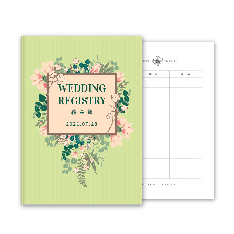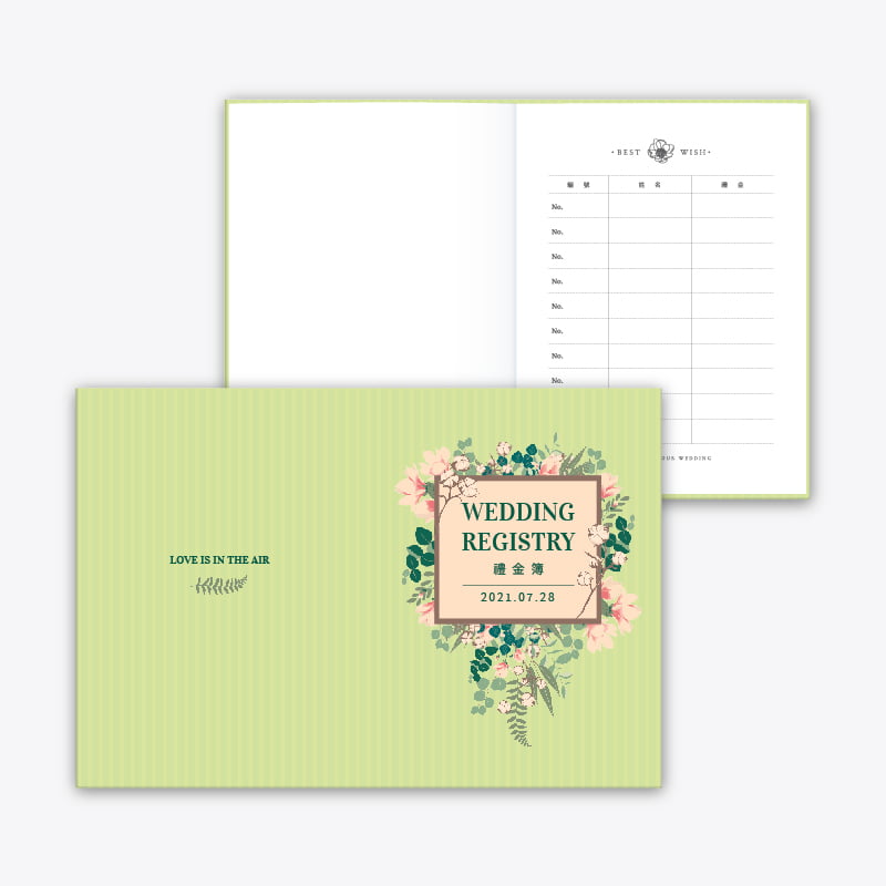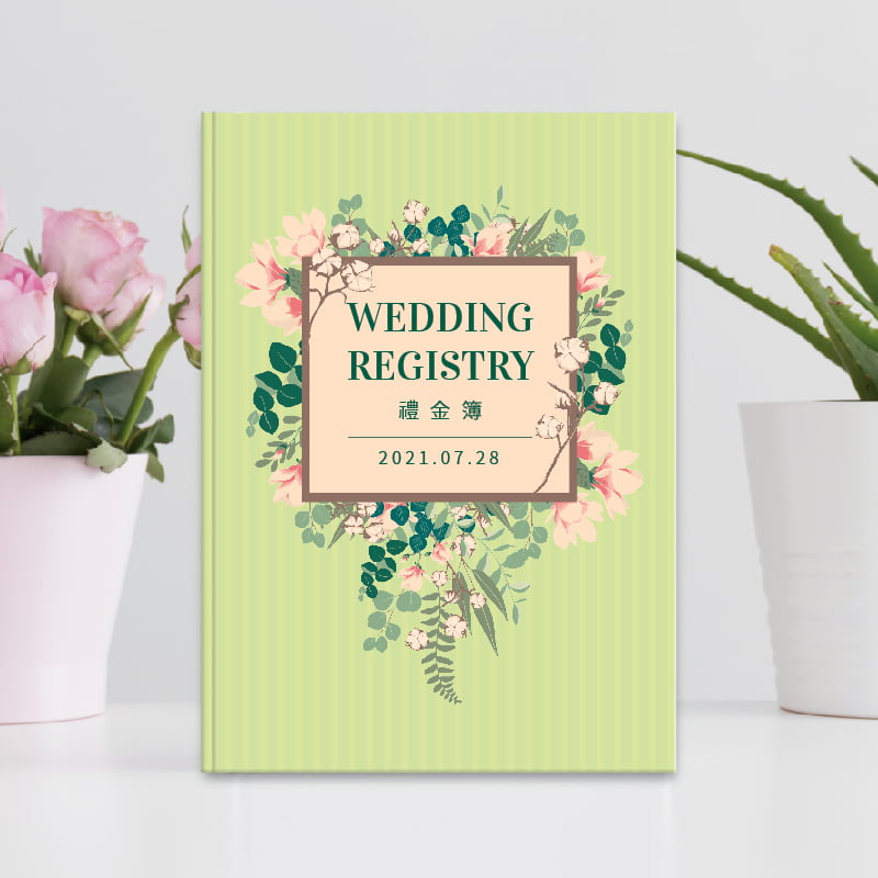 婚禮收禮處使用的禮金簿,可客製調整封面與封底,表面霧膜滑順觸感,24 頁畫刊紙內頁共240欄,每頁可書寫 10 位賓客