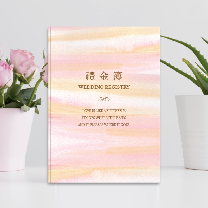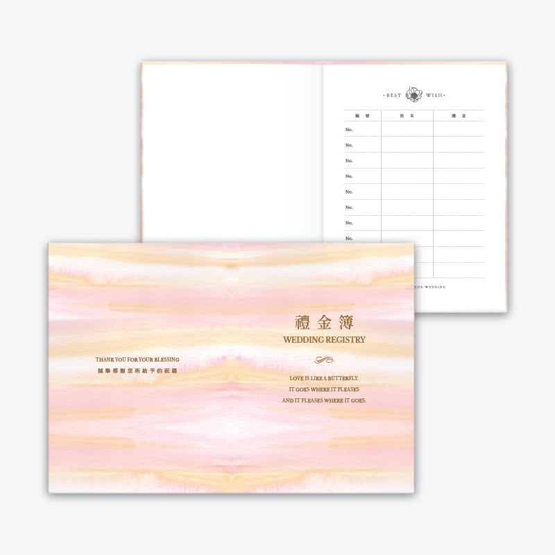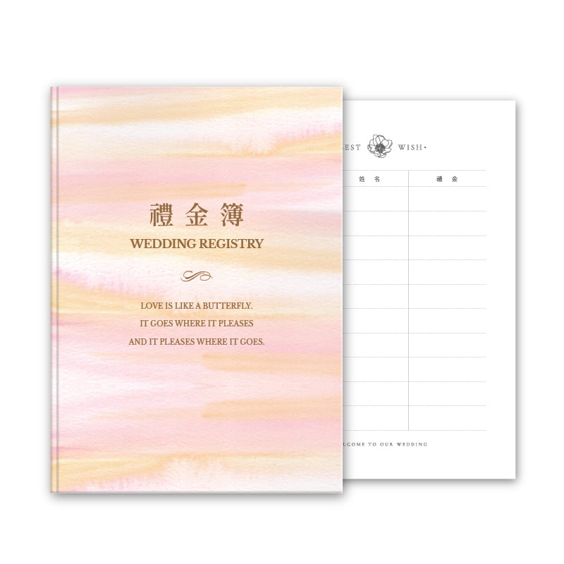 婚禮收禮處使用的禮金簿,可客製調整封面與封底,表面霧膜滑順觸感,24 頁畫刊紙內頁共240欄,每頁可書寫 10 位賓客